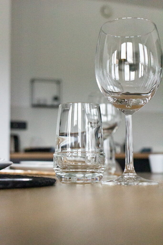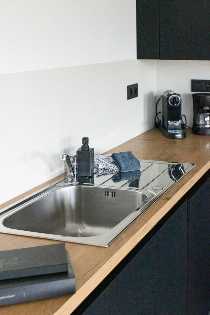 Avec vaisselle, couverts, machine à café, grand réfrigérateur, congélateur, évier, four et lave-vaisselle.